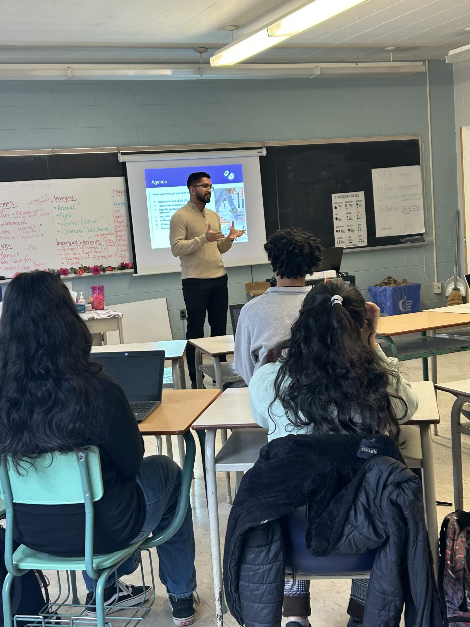 A student presenting their AI project at a workshop showcase, demonstrating the practical application of AI in solving real-world problems.